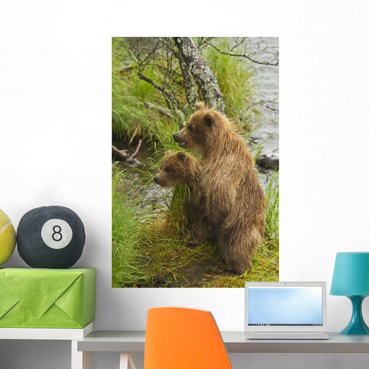 Brown bear cubs standing upright on a grassy bank of Brooks River Wall Mural