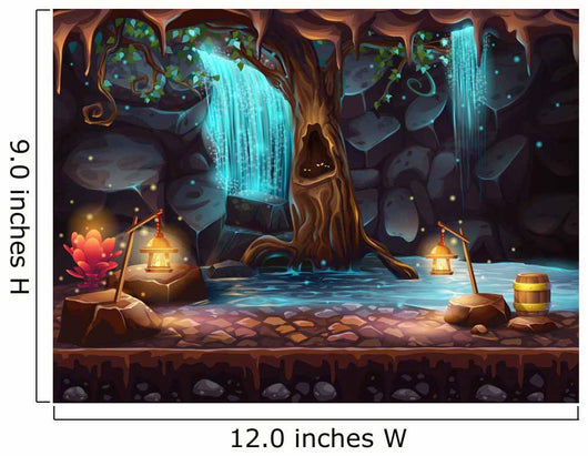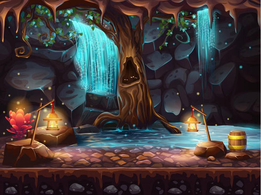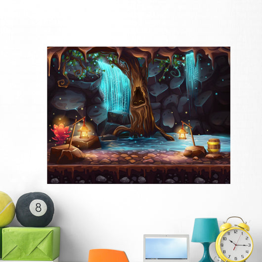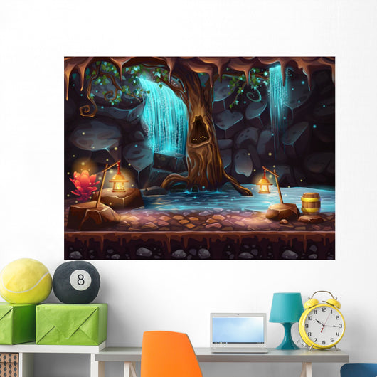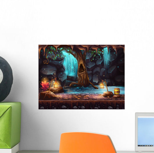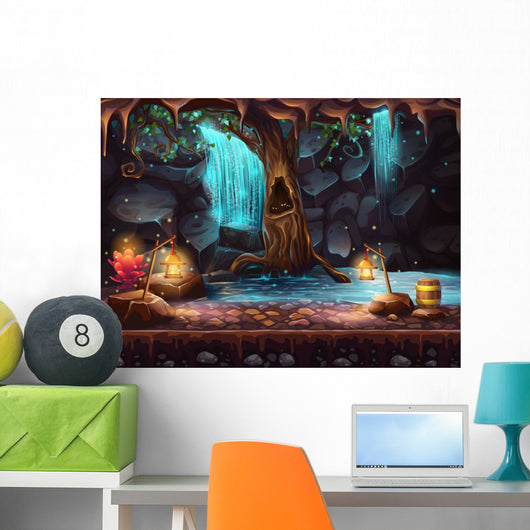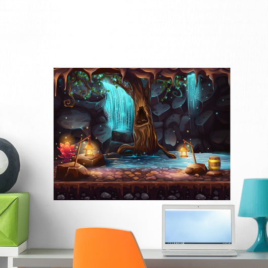 Cave With A Waterfall And A Magic Tree And Barrel Of Gold Wall Decal