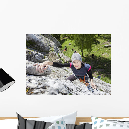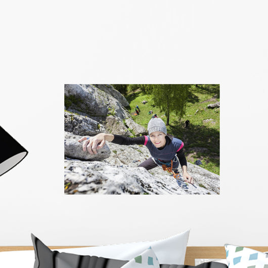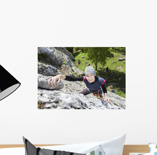 Happy Woman Climbing Rock Wall Decal