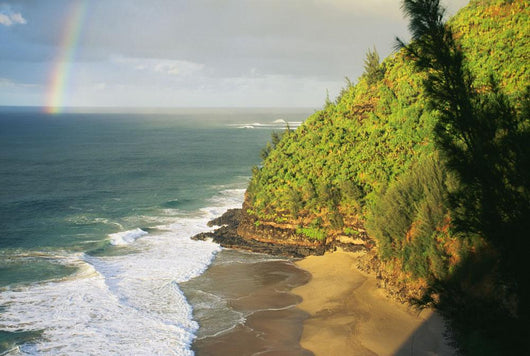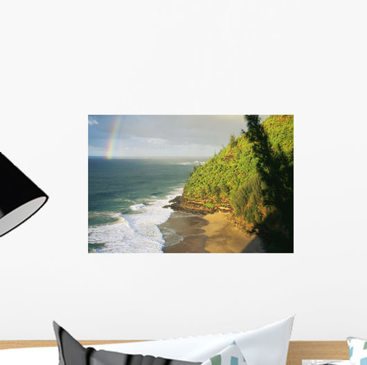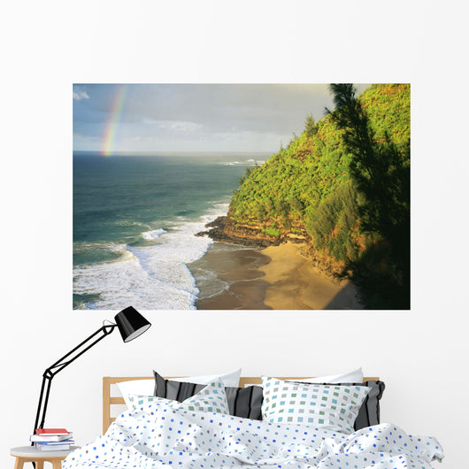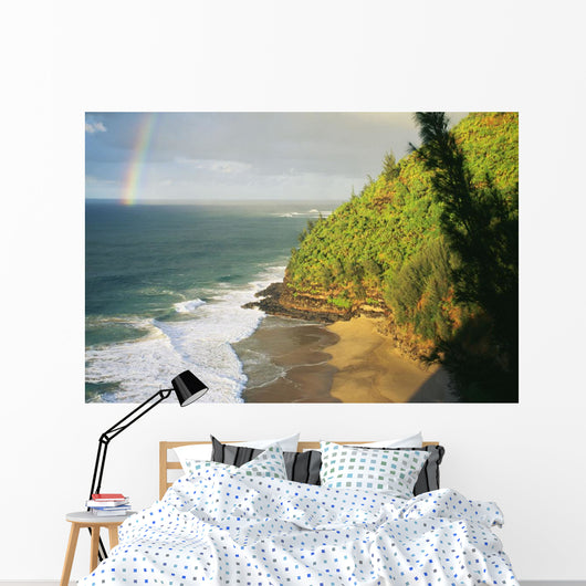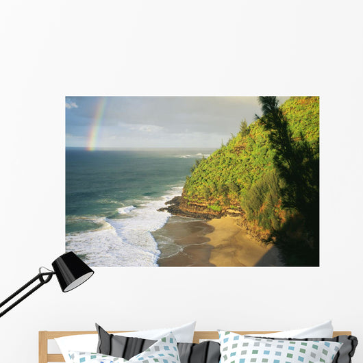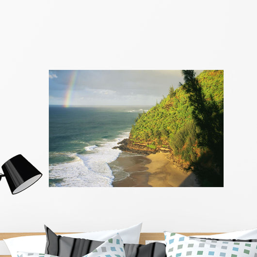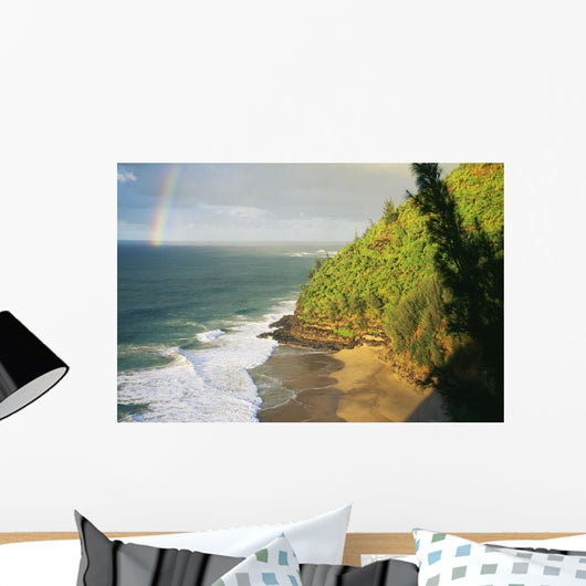 Hawaii, Kauai, Napali Coast, Hanakapiai Beach, Rainbow In Distance Wall Mural
