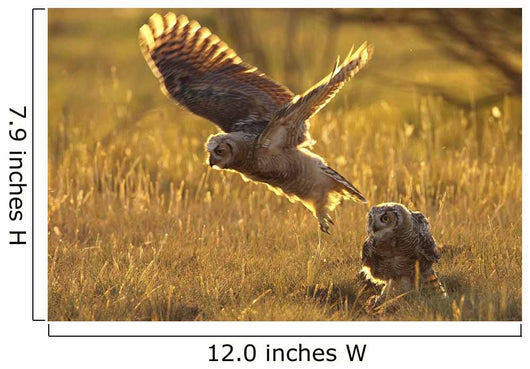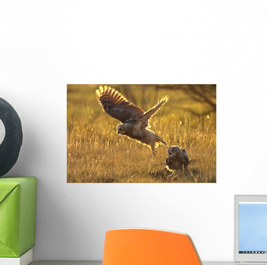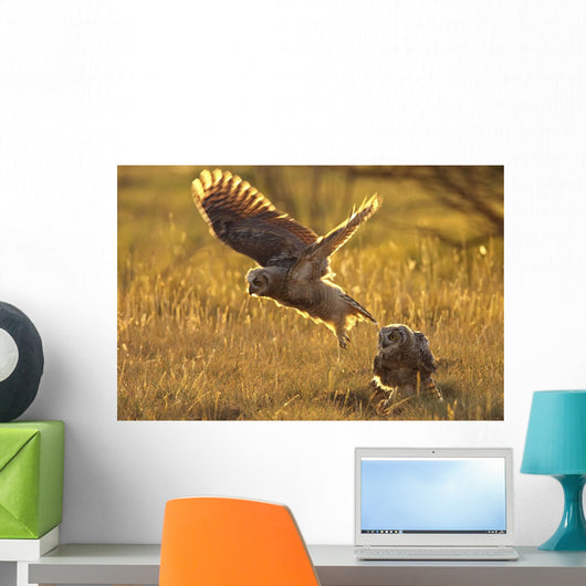 Immature Great Horned Owls Backlit In A Grass Field, Saskatchewan Wall Mural
